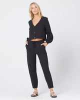 Terry cloth is back in a big way with the Dune Pant. These soft and cozy pants feature cropped + cuffed legs, an elastic waist with drawstring detail, and side slit pockets. Pair with the matching Romy Sweater for a seriously cozy look.