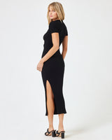 Upgrade your everyday look with the Lena Dress. Our signature rib knit is leveled up in a wider fabrication. This fitted frock has a tailored collared v-neck, button-front bodice with a cut-out + leg slit.
