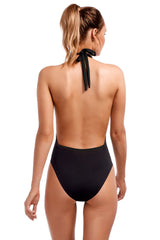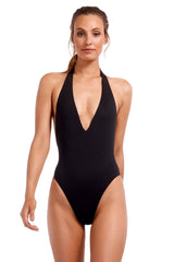A deep plunge, and (ultra sexy) scooped back give this bodysuit 70‰۪s supermodel vibes. With minimal lining, a comfortable two way stretch, a clean finish and sexy silhouette you can wear this bodysuit all day.Style + Substance. Vitamin A's signature Little Black Bikini (LBB). Black EcoLux is a superfine matte jersey with superior stretch, made locally in California from recycled nylon fiber. MADE IN USA 83% Recycled Nylon + 17% Lycra