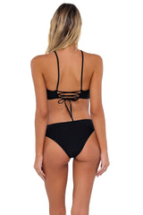 Roya is a high neck top with a corset-inspired lace-up back detail. She has an elegant cut and a perfect fit. She also has removable cups and cord tips.