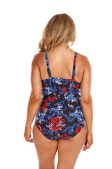 The Embroidered Roses underwire one piece plus size swimsuit is vibrant and colorful patterned bathing suit. The underwire one piece swimsuit is the ideal classic one piece featuring plenty of structure, style and a chic Embroidered Roses print. This underwire one piece plus size swimsuit features a natural v-neckline with ruching around the trim for added detail and style. The bust is supported by an underwire DD/E cups and also has a mastectomy pouch for added versatility. The bust ends with an empire waist style band and helps to divide the sections of the swimsuit . This swimsuit also has a mastectomy pouch. The underwire one piece swimwear perfectly embrace your curves by featuring vertical ruching around the bust and horizontal ruching around your waist and torso. The torso ruching begins form under the bust and ends at the bottom of the underwire one piece swimwear to provide plenty of style to accentuate your curves. The style of the plus size underwire one piece bather continues with the fun and inspired print. The print features a cool embroidered roses design in beautiful reds, blue and white con a solid navy background. What's more, the print is featured on the entire underwire one piece bather for a consistent and stylish look. This fun and striking underwire one piece plus size swimsuit has adjustable straps. Feel comfortable to adjust your swimsuit to fit perfectly every time you wear it. The underwire one piece swimsuit also features a classic, straight across back line for a chic style to help you stand out. Additionally, for added flexibility wear this underwire one piece plus size swimsuit which has a traditional bather bottom so you have plenty of movement for every activity in and out of the water to enjoy this summer!
