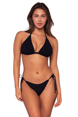 Your favorite style just got an upgrade! This classic triangle is smocked and has a small ruffle along the neckline. The Kali Triangle features string tie spaghetti straps neck and back closures, and removable cups. Coverage: Moderate. *Bottom sold separately. Fabric Content: 87% Recycled Nylon,13% Spandex